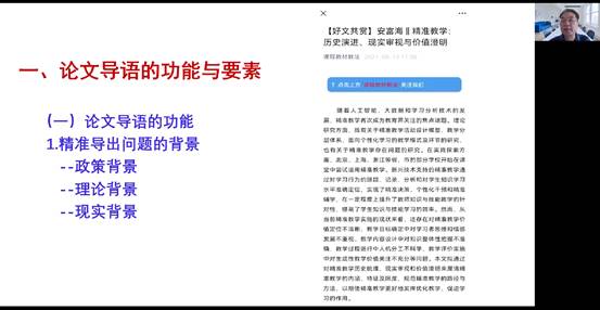 在完成了引导性的讲解后,郭教授以一线教师的论文导语作为案例分析,根据其中存在的问题进一步深化了教师对论文导语表述要求的认识。最后,郭教授带领参会教师以《XXX学科教学中复杂问题解决学习的探索》为题现场创作论文导语,并根据教师们提交的导语进行了针对性的反馈。