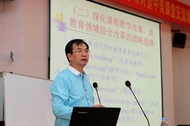 本次会议时间为11月25日和26日两天,内容安排主要由三部分共同构成:专家报告、课堂展示、工作坊活动。大会专家报告主要有郭元祥教授的《深度教学的理念与策略》、叶显发教授的《课堂教学改革的路径》、王海玉特级教师的《深度教学的实践探索》、伍远岳博士的《深度教学的几大策略》等,从理论层面使教师们理解深度教学的理念,明确深度教学的实践策略,为教师们贯彻和实施深度教学理念指明了方向。课堂展示部分则采取中外交流、校际展示的方法,所有参会教师共同聆听了来自美国加州的名师Andrew和Melisa讲授的两节常态课,使人耳目一新,引发了巨大的思想震动。接着又分别举办了初中阶段语文和英语同课异构展示活动,小学阶段语文和数学展示课活动,每一节课都是由不同地方的教师完成讲授,在展示课结束还进行了评课研讨活动,采用了专家主评、各地教师共同讨论的方式,使教师们在深度教学理念引领下,展开了对课堂教学深度的思考和探索。工作坊活动主要包括校长工作坊和卓越教师工作坊,校长工作坊旨在从学校教学政策、教学理念入手,探索贯彻落实深度教学的路径和方法,各地相互交流成功的经验,总结失败的教训,就坚持深度教学理念达成了共识。卓越教师工作坊则主要是以参加大亚湾经济技术开发区卓越教师培训计划的学员们为对象,在会上,郭元祥教授对卓越教师寄予厚望,并对他们提出了深入贯彻深度教学理念、研究和实践并行、争做领军教师的要求,鼓舞了与会教师进行深度教学实践探索的勇气,坚定了其实现深度教学课堂的信心。