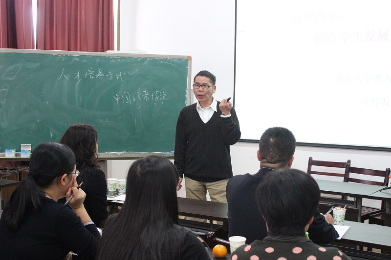 11月3日早上8点10分,鱼峰区的梯级教师们与华中师范大学教育学院郭元祥教授以及班主任等在教师教育学院门前合影。8点30分,在教师教育学院A501举行了2015年柳州市鱼峰区梯级名师培训开班典礼,其间李蔓主任主持,政协副主席谷音发言,表达了在此次培训中对教师们的期望与要求。继开班典礼之后,郭元祥教授就“深度课堂与深度教学:理念与策略”做了专题讲座。郭教授教授讲解了课堂与教学为什么需要深度变革的问题,向教师们阐明了深度课堂的四个特征,重点地传达了深度教学的先进理念以及深度教学的具体可行策略。教师们对郭教授的深度教学理念赞不绝口并纷纷表示回去实践的倾向。课后李蔓主任总结了对郭教授与鱼峰区阶梯教师培训的渊源并表示衷心的感谢。下午14点30分,叶显发教授以生动幽默的方式讲解了“中小学课堂教学改革的实践”,课上赢得了梯级教师们的阵阵笑声与掌声。