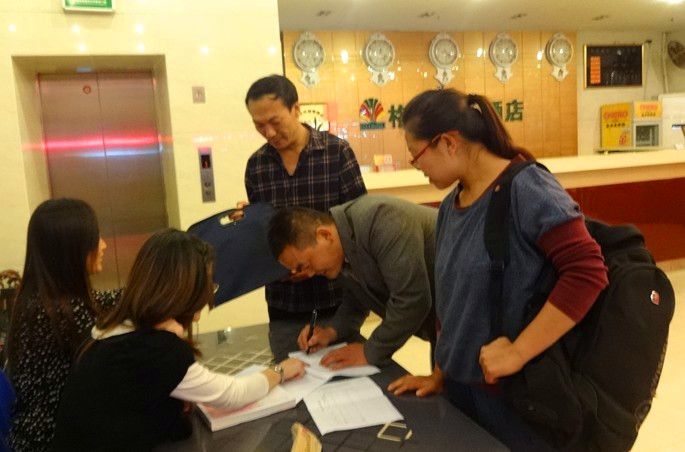 工作人员一大早就在武汉格林民族酒店的大厅里集合并做好准备工作,等候从山西前来参加培训的教师们,为他们办理登记手续、安排住宿、发放餐卡和培训资料袋等。资料袋中装有《综合实践活动课教师用书》、《教师的二十项修炼》、《学员手册》、学员证、武汉地图、笔记本、中性笔、华中师范大学信纸。工作人员向已抵达的山西教师们关切地询问旅途境遇和对武汉的初始印象,并向他们详细介绍了培训的上课地点、餐卡的使用范围和武汉格林民族酒店的无线网络服务,提醒他们观看张贴在酒店宣传栏上的写有各种注意事项的《报到须知》。随后,已抵达的山西教师们在武汉格林民族酒店的总服务台办理了酒店入住登记手续。工作人员还不时地与路途中的山西教师们进行沟通,询问大概的抵达时间,帮助找到报到地点,山西教师们纷纷表示华中师范大学基础教育课程研究中心的这些安排让此次培训的学习和生活变得十分便捷。