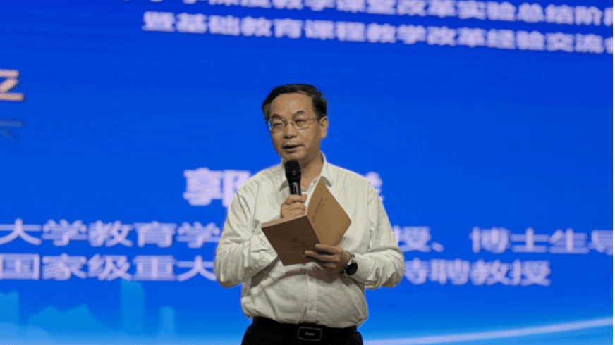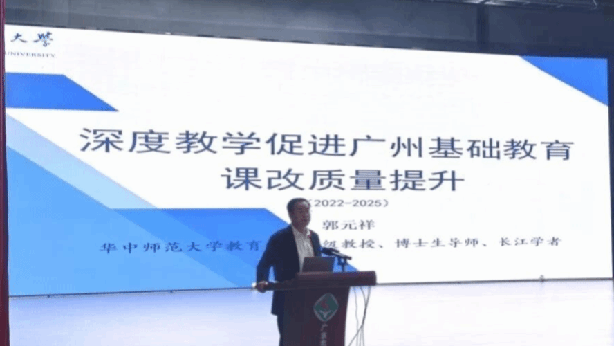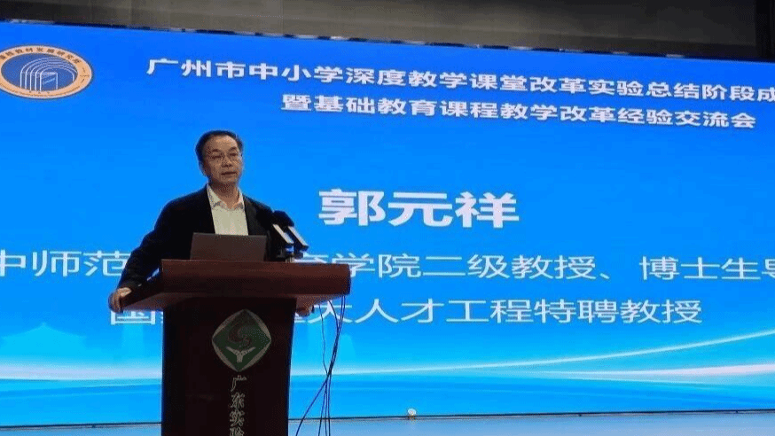 华中师范大学教育学院二级教授、博士生导师、国家级重大人才工程特聘教授郭元祥致辞。郭教授指出,在课堂改革期间与广州市155所深度教学试点校开展了25场理论探讨、44场课例研讨与3次监测调研,持续探索课程改革深化的重大问题,扎根课堂教学,紧扣国家课程方案与课程标准,明确课改要建立的价值导向,并祝愿广州市基础教育取得更大成效!