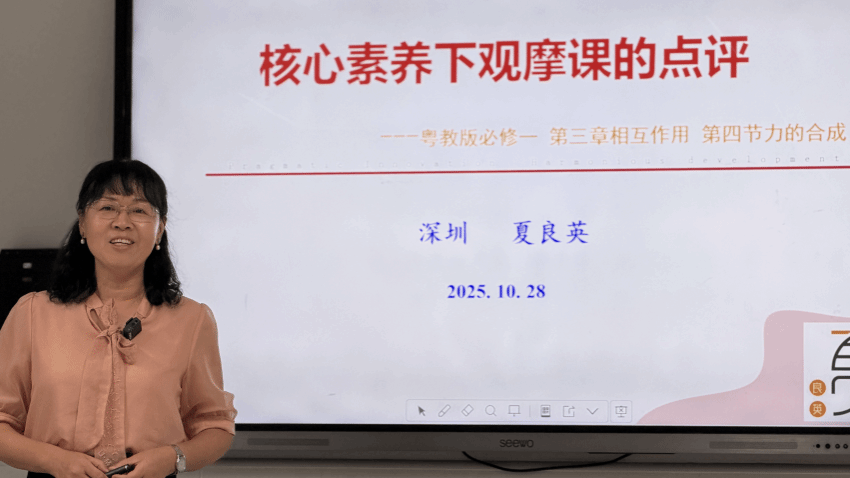 深圳市龙华高级中学教育集团高中部正高级教师夏良英作精彩点评。夏老师强调,教师应从学生的真实需求和认知起点出发,教学设计和课堂推进应符合学生的心理特点和认知规律,要引导学生亲自参与知识的再发现过程,来挖掘蕴含在学科知识中的思想与方法。夏老师进一步指出,要以思维为中心重演知识,让学生揭示并感受物理知识发生的原因、形成的经过与发展的方向。此外,还从教学内容分析、教学环节设计、教学流程图、教学亮点等方面对本节课进行了更为深入的分析与指导,肯定了本节课能够以素养为导向、注重教学内在逻辑、关切真实物理情境,为教师提升教学实效点明了方向。