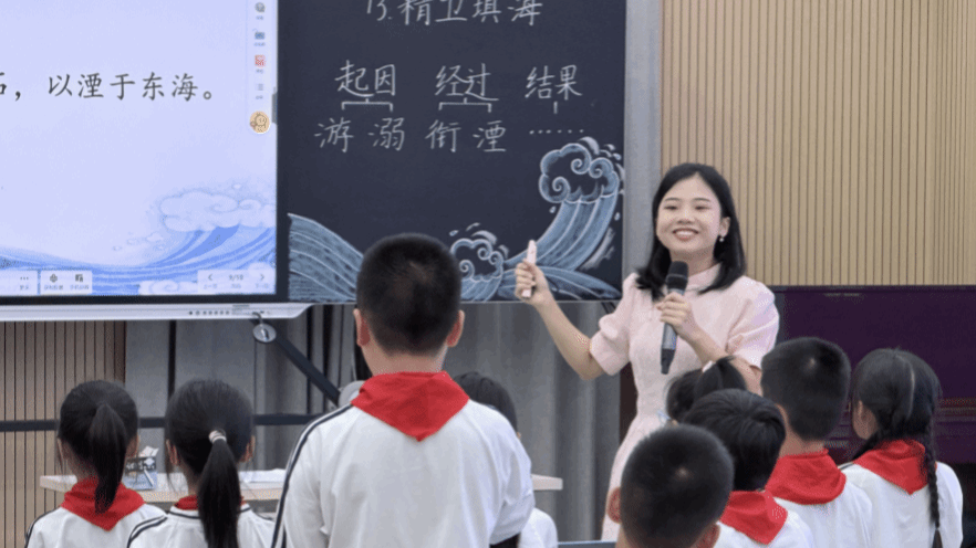 由广州市荔湾区西关实验小学叶萍老师执教小学四年级语文《精卫填海》一课。叶老师首先创设了一个“我是神话传讲人”任务情境,来激发学生的学习兴趣,并依据不同的任务要求设置了递进式的任务活动,引导学生完成“讲清楚→讲生动→讲深刻”的能力进阶。在活动过程中,叶老师多次运用AI辅助教学过程,通过课前作业的AI分析数据反馈易错字,引入个性化的AI学伴实时点评、反馈学生的故事讲解练习,引导学生在AI的智能化辅助下实现能力的跃升。